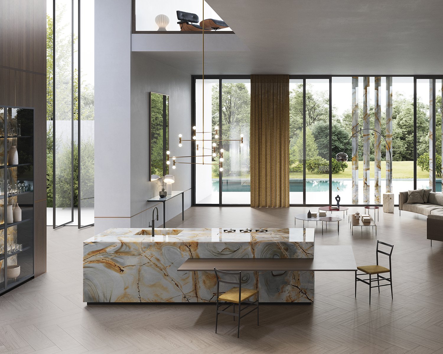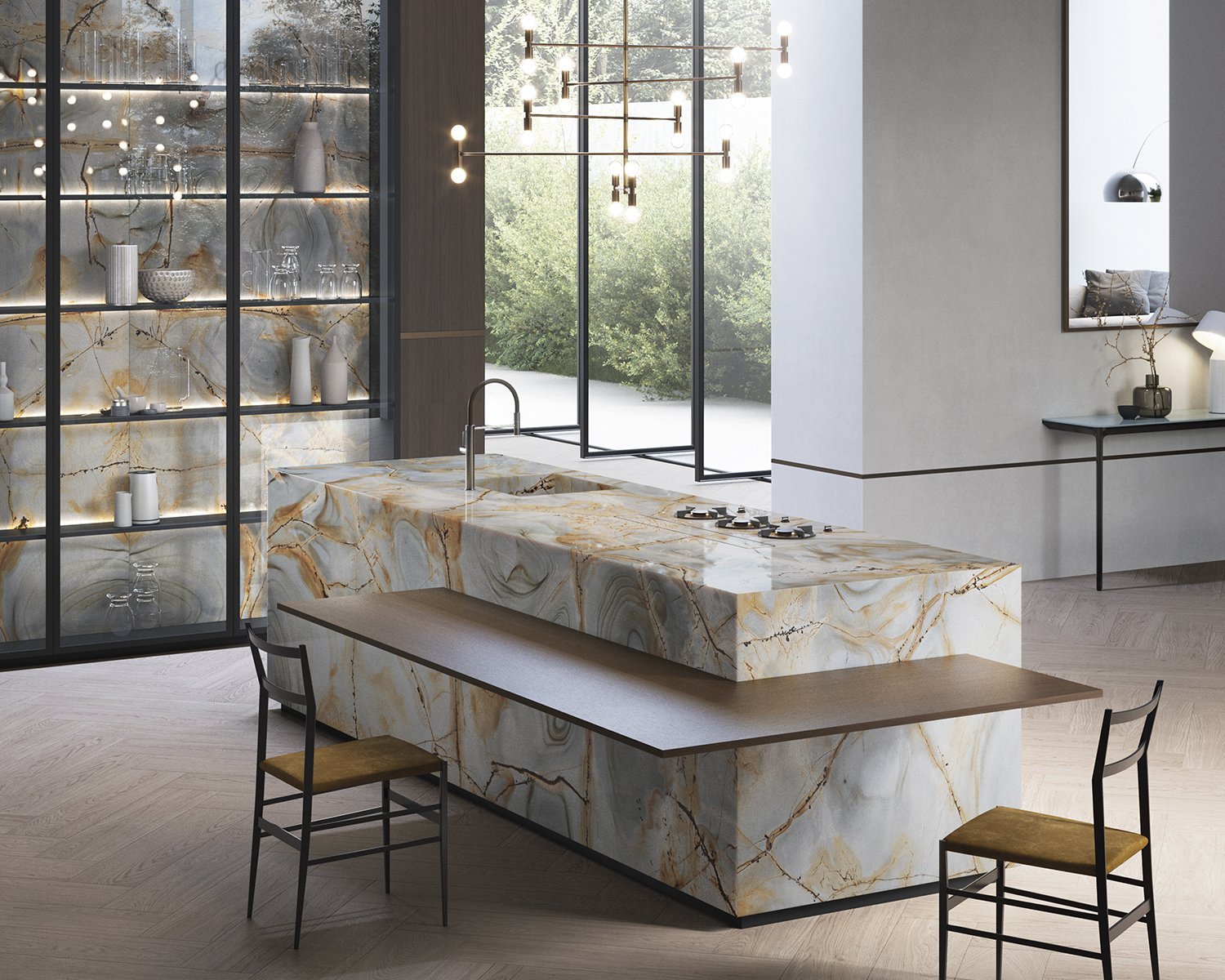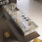 Captivating in appearance, glorifies the chromatic contrast between the greyish blue of the stone and the coppery veinage of its theatrical structure. Blue quartzite becomes the focal point of any room and perfectly dovetails in natural designs with an elegant character.