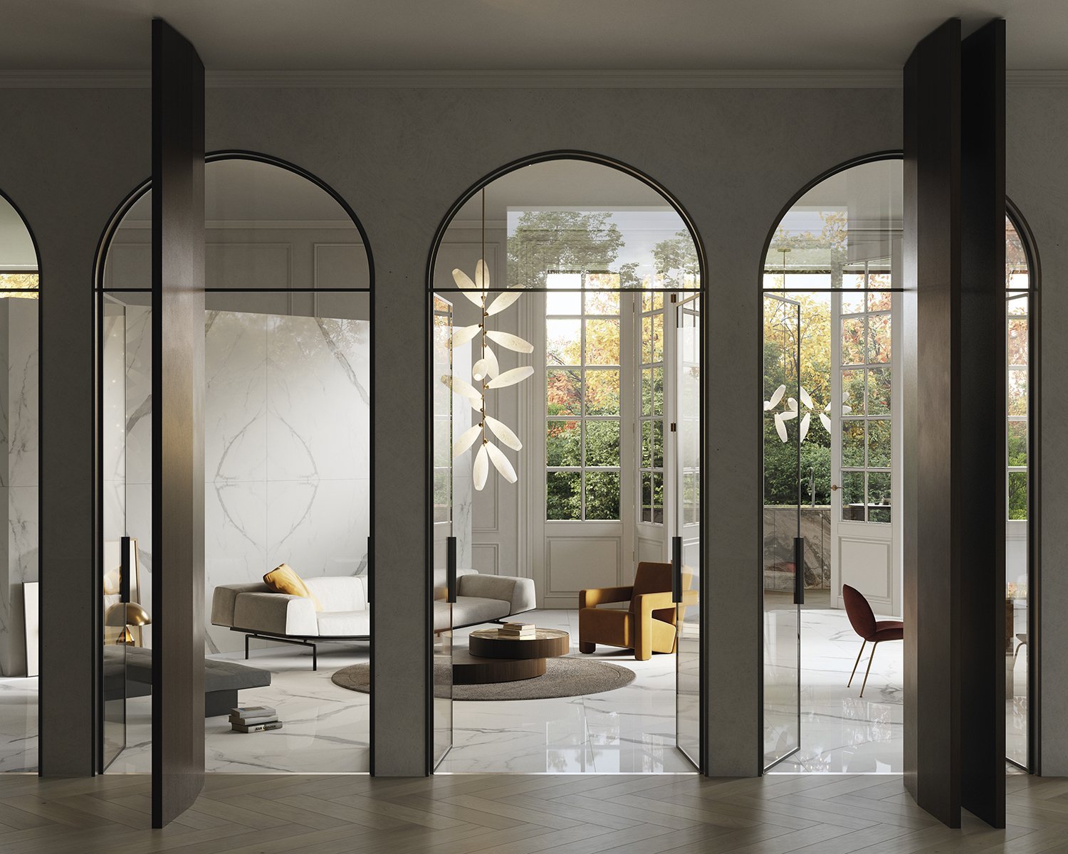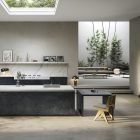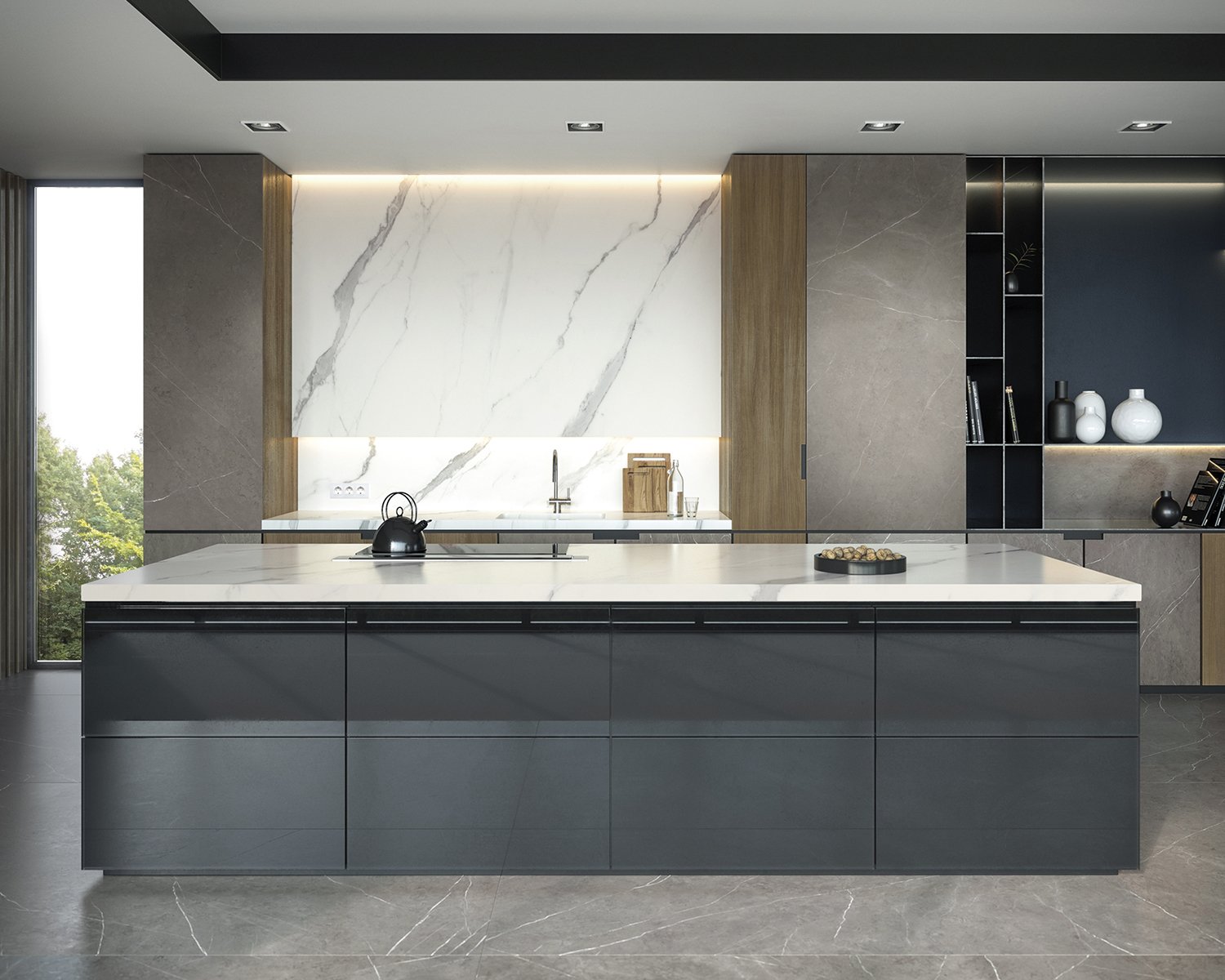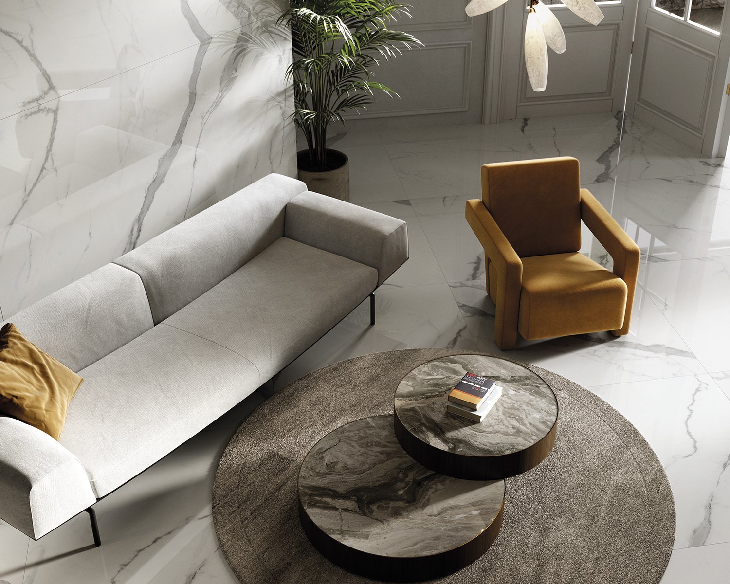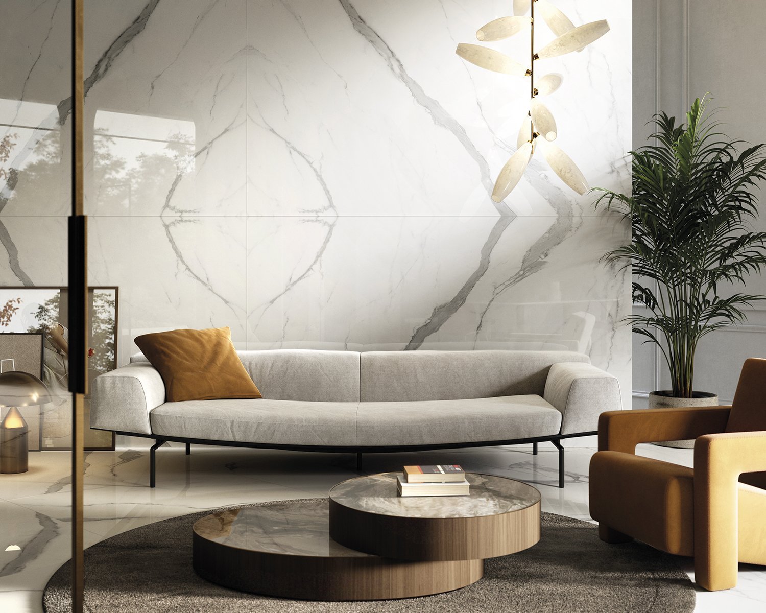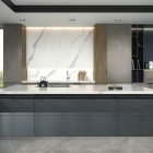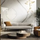 The beauty of the Statuario Venato marble is materialised in a luminous canvas that highlights the greyish shades of a dramatic veining. The suggestive character of Aria White brings together the tradition of classical marble in a perennial design. The most whimsical splendour.