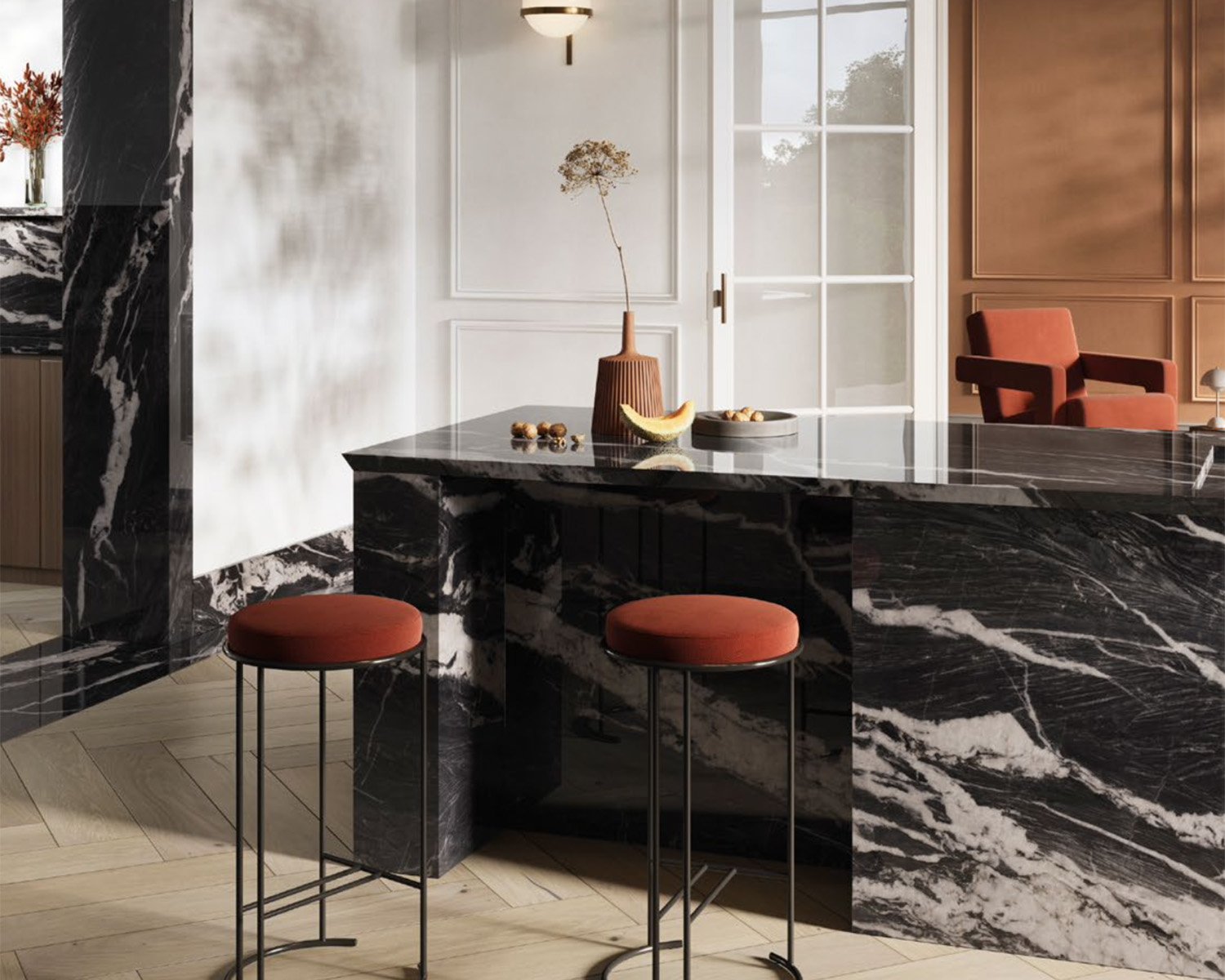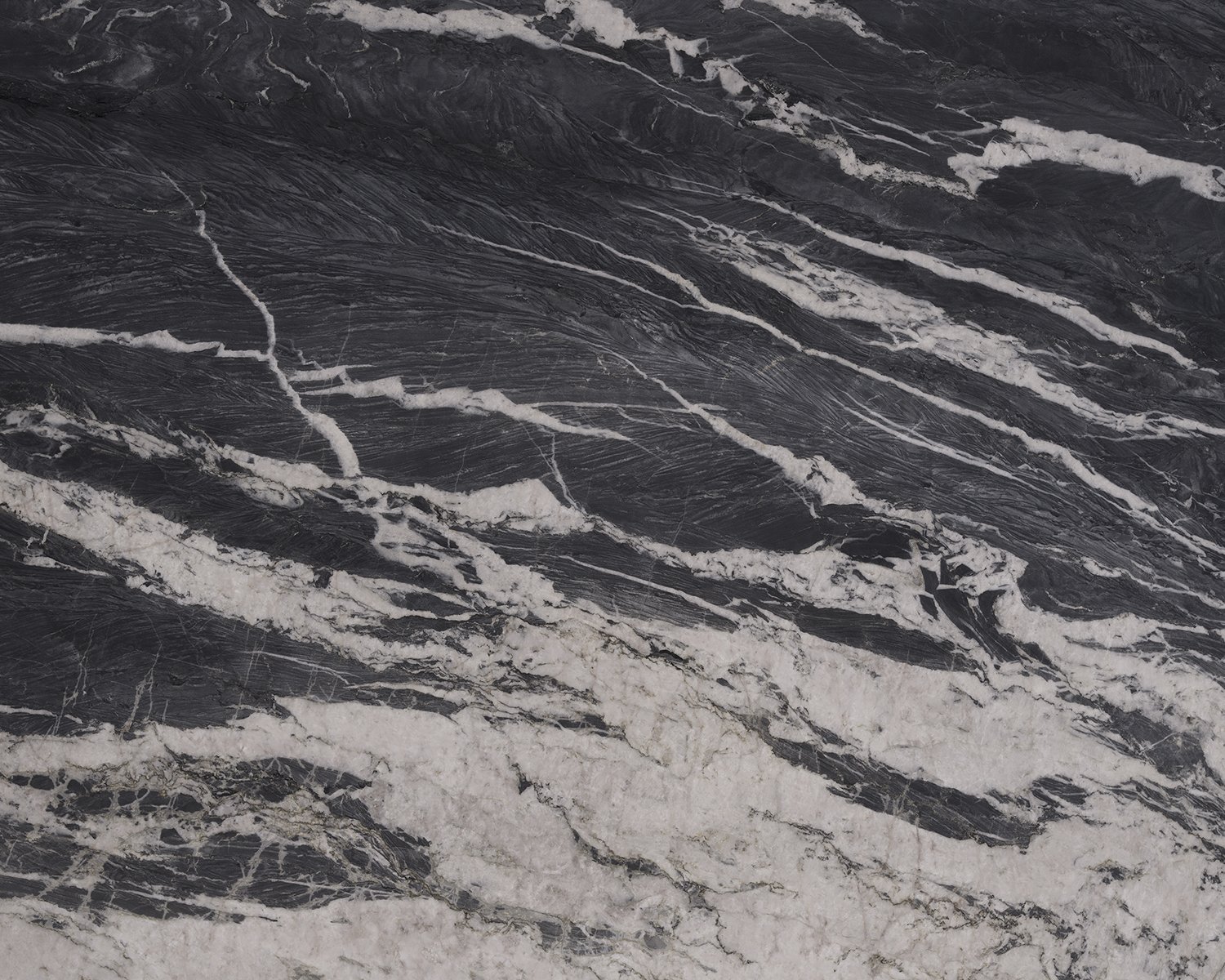 With a strong personality and extreme beauty, Cyclone surprises with a dark background; infinite intersecting veins and gradients that emulate a darkened sky characterised by a chromatic contrast between black and white. Its uniform appearance gives spaces an air of distinction, endowing them with exclusivity.