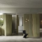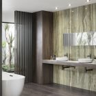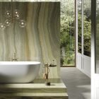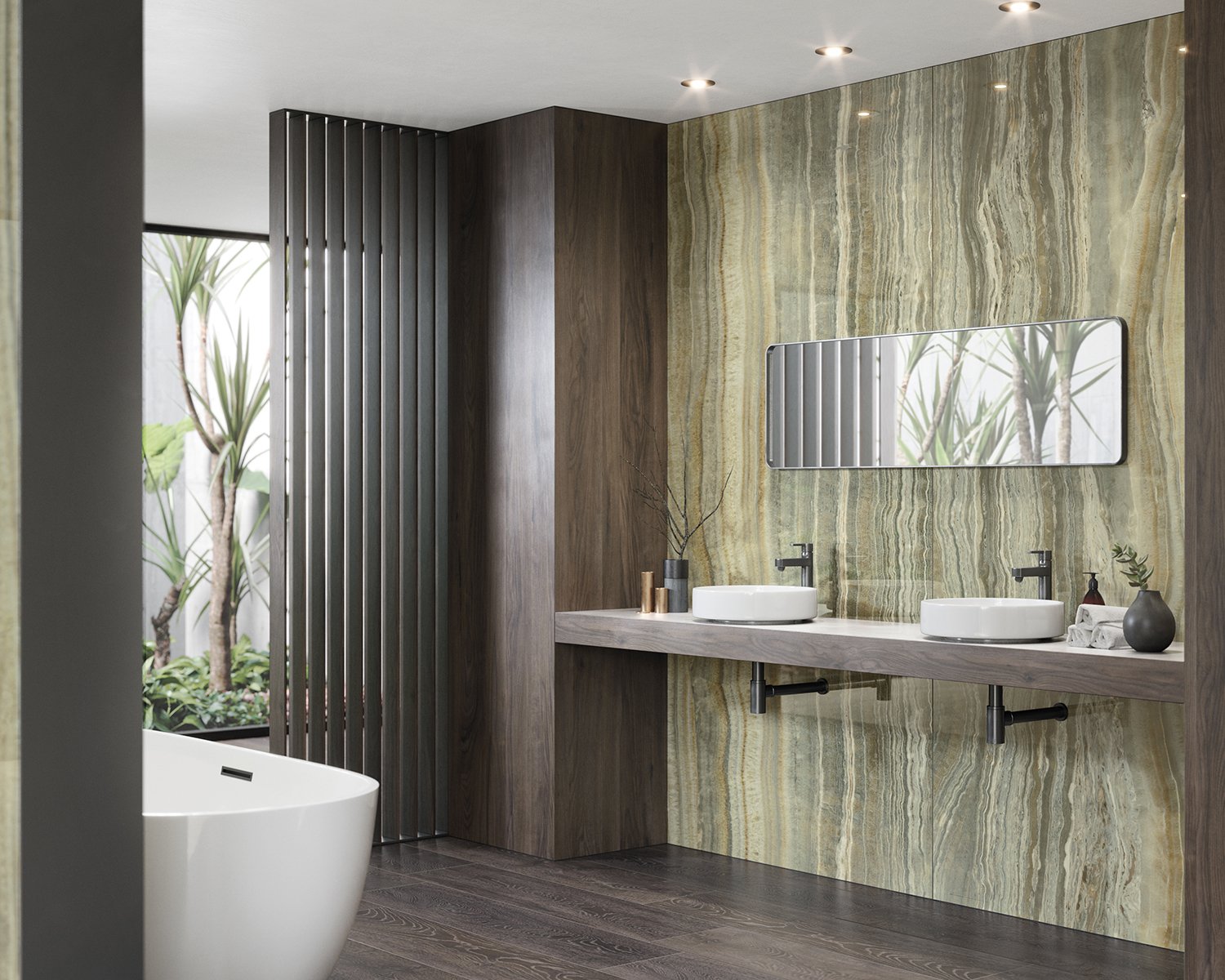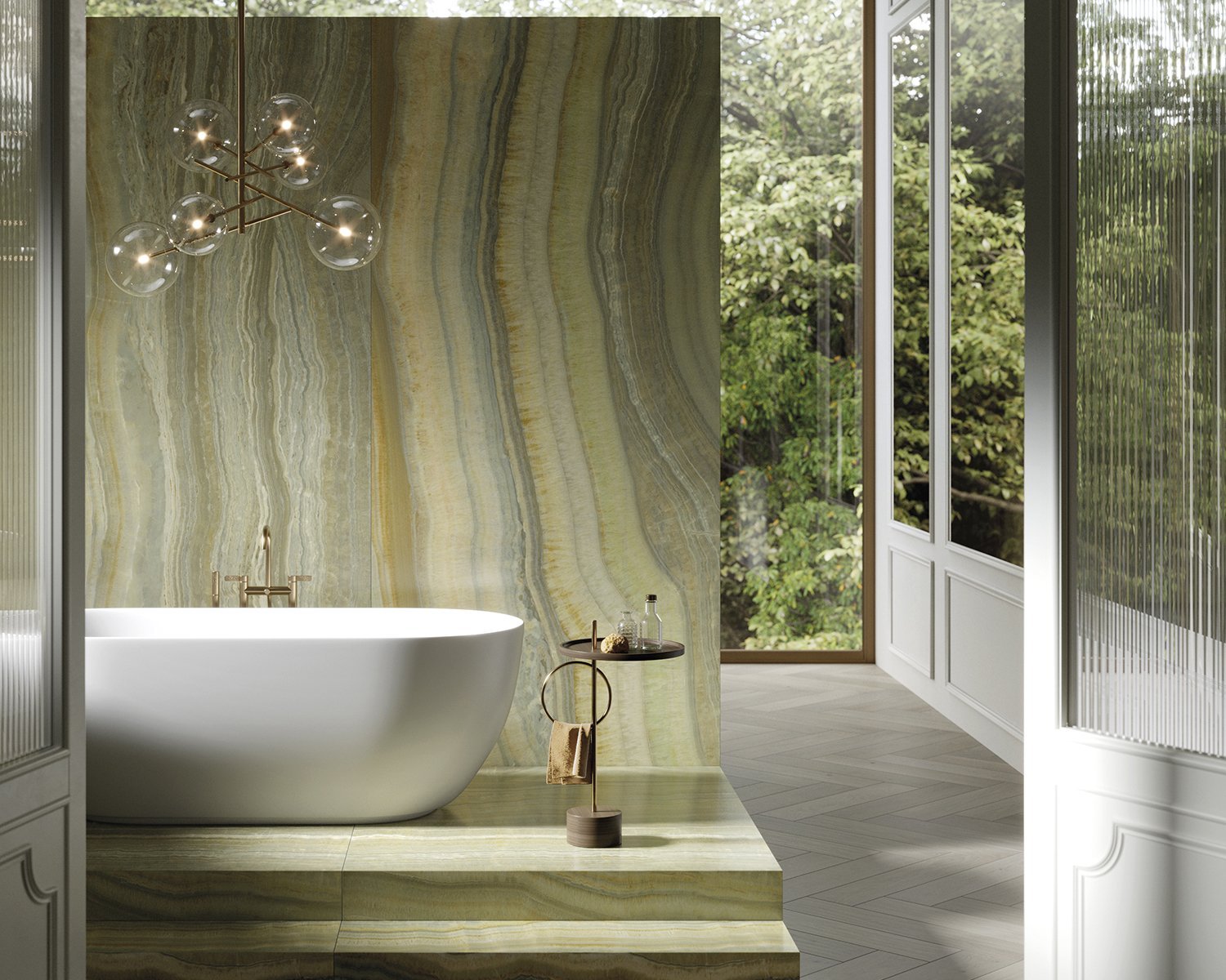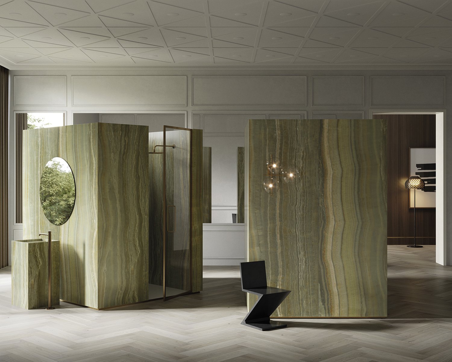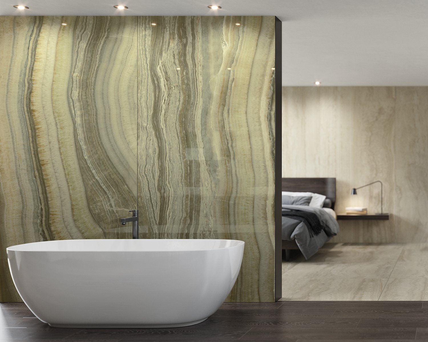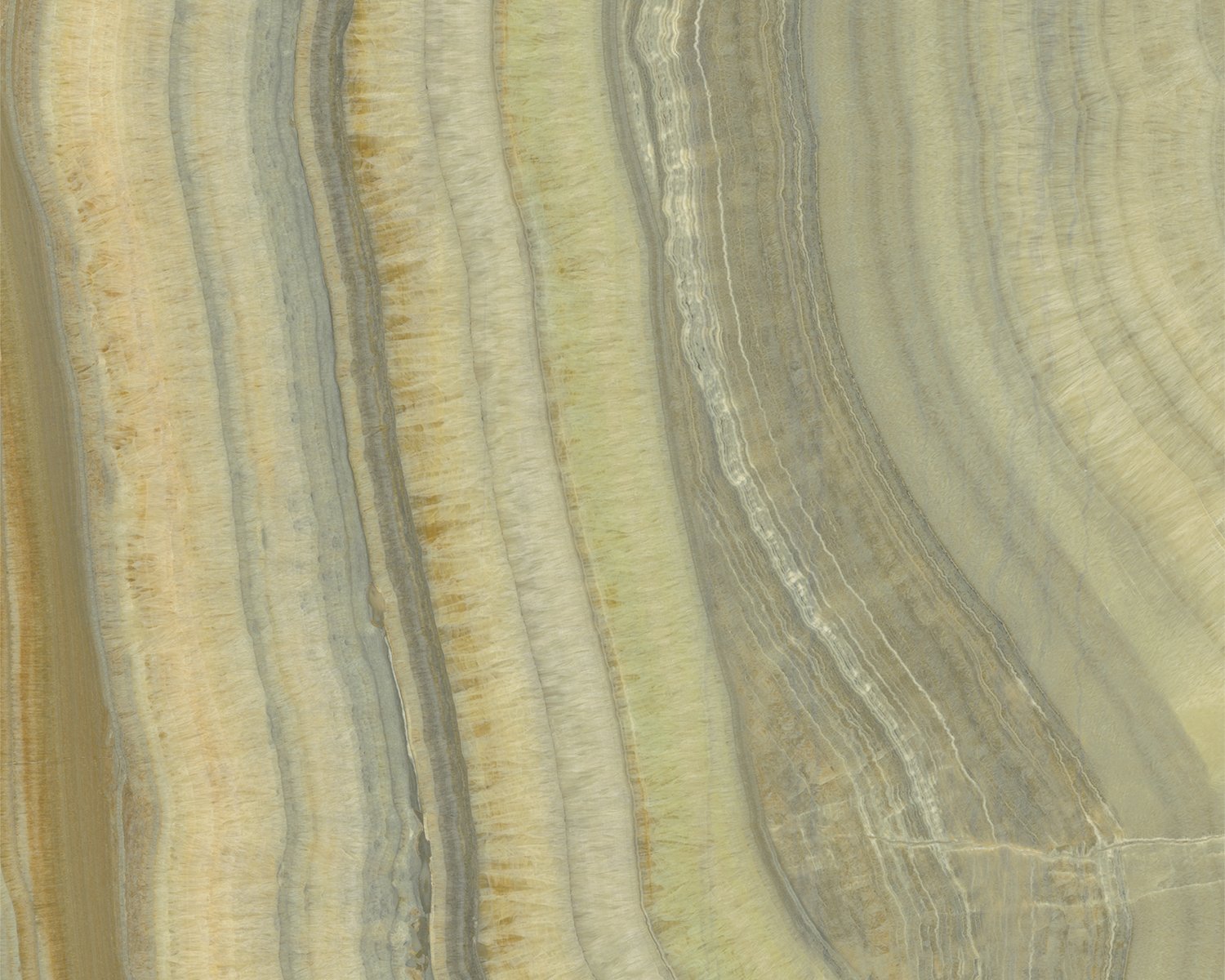 Mineral of volcanic origin whose shades of green and beige form an infinite pattern of wide and elegant grooves. The vividness and translucent backlighting effect generated by its warm chromaticism make it an ideal design for spaces with a lot of personality.