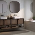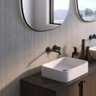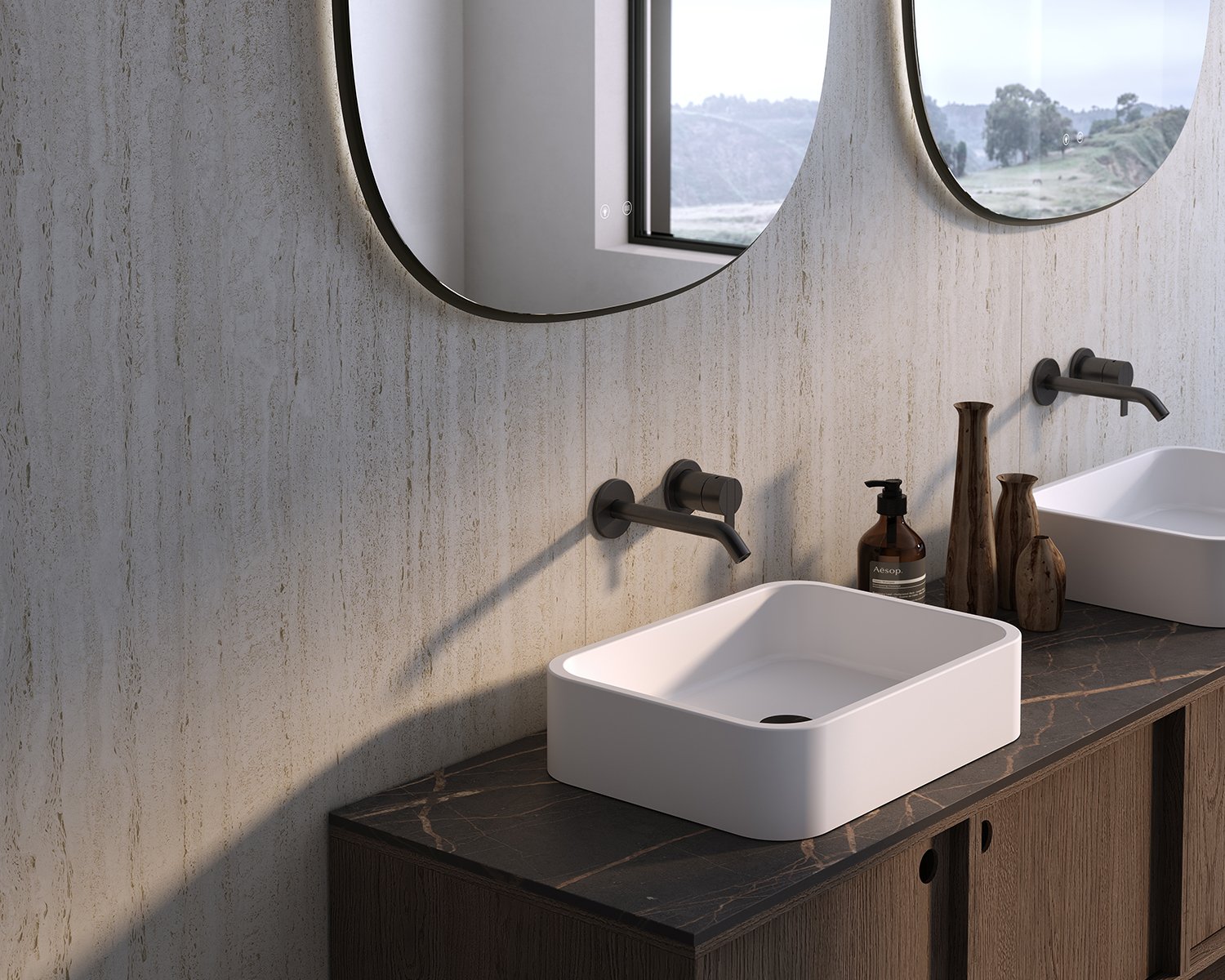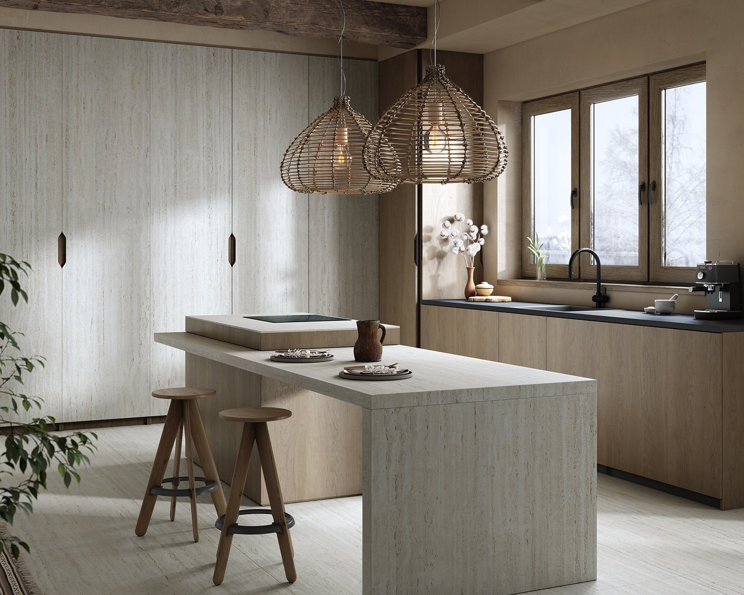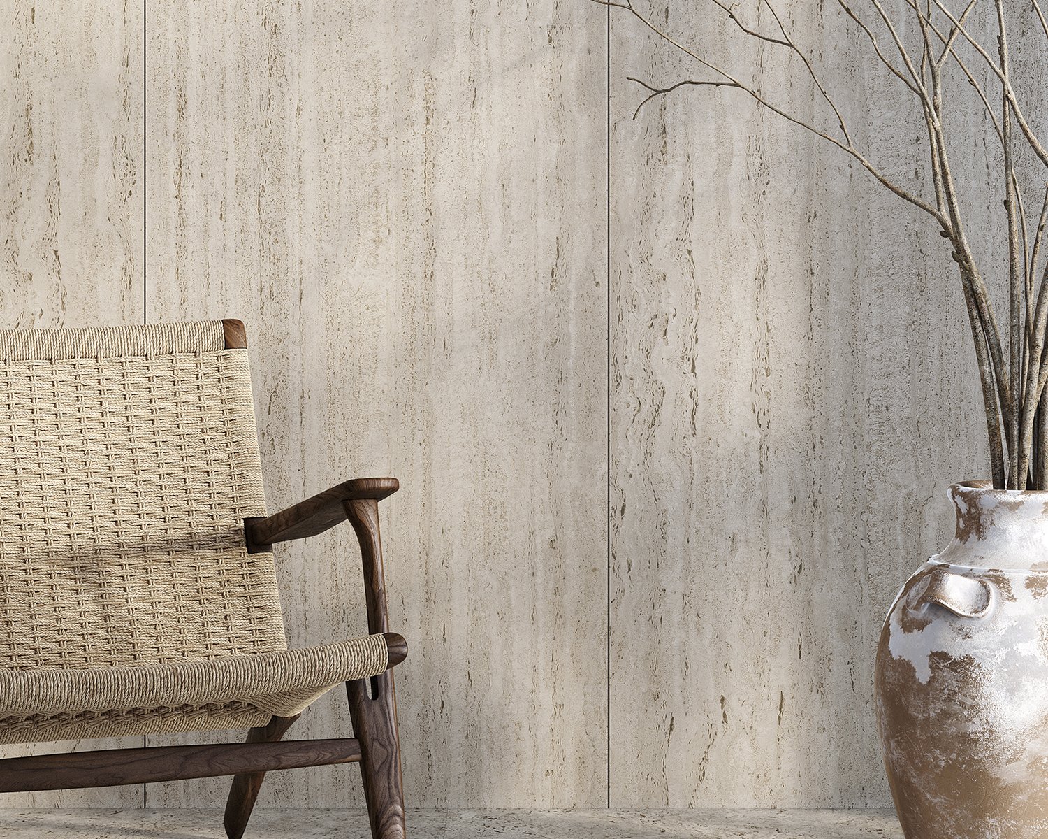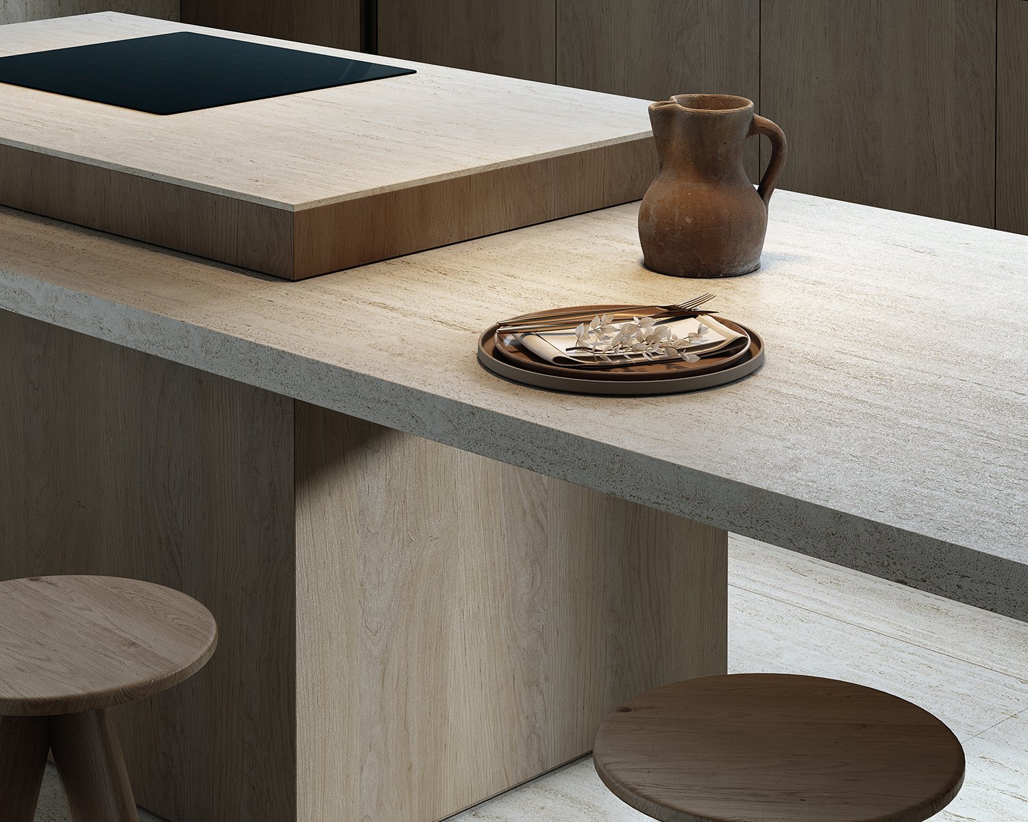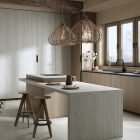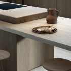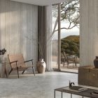 Its light striped structure with filled pores, which gives an elegant, bright and lightweight look to any design, is inspired by Travertino Navona, a natural stone quarried near Tivoli, east of Rome.